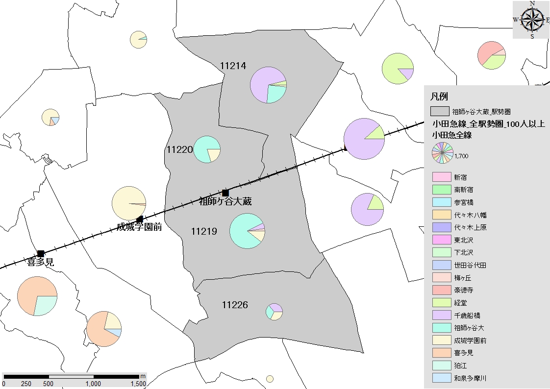 祖師ヶ谷大蔵駅の駅勢圏は、灰色で陰影した北から南に連なる4地区で構成されます。 地区11219と11220は、駅を中心に南側と北側の中心地区で、一部が西側の成城学園前駅に 流出しています。北端の地区11214は、東側の千歳船橋駅の駅勢圏に含まれますが、かなり の初乗り人員が祖師ヶ谷大蔵駅にも来ています。南端の地区11226は、3駅の利用者がいる 地区です。